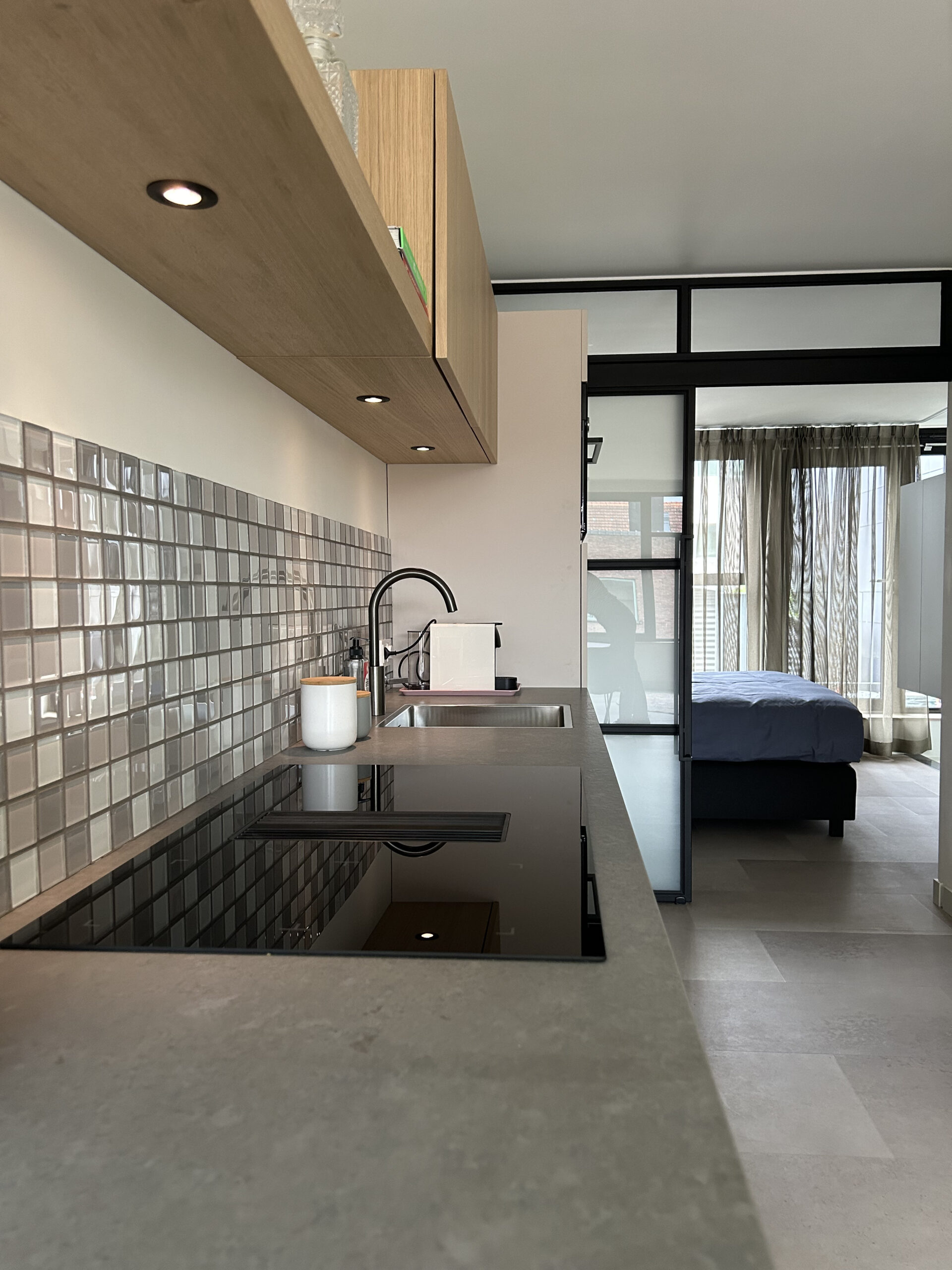 Je eigen etage van 50m2 met alles wat je hartje begeert. Een geweldige keuken, heerlijke stijlvolle eet/woonkamer, en-suite slaapkamer met 2-persoons boxspring. De luxe badkamer ligt naast de slaapkamer en is van alle gemakken voorzien. Uitzicht aan de voorkant over de stadskantoren en achter op je eigen patio stads balkon! Hoog boven de drukte van de stad je eigen – o zo lieve- oase van rust.